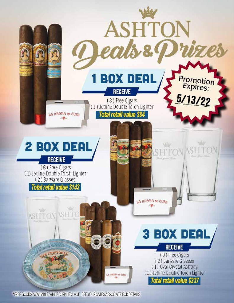 Stop in and stock up during our Ashton Mega Promotion featuring deals on all your favorites from Ashton, La Aroma de Cuba and San Cristobal!