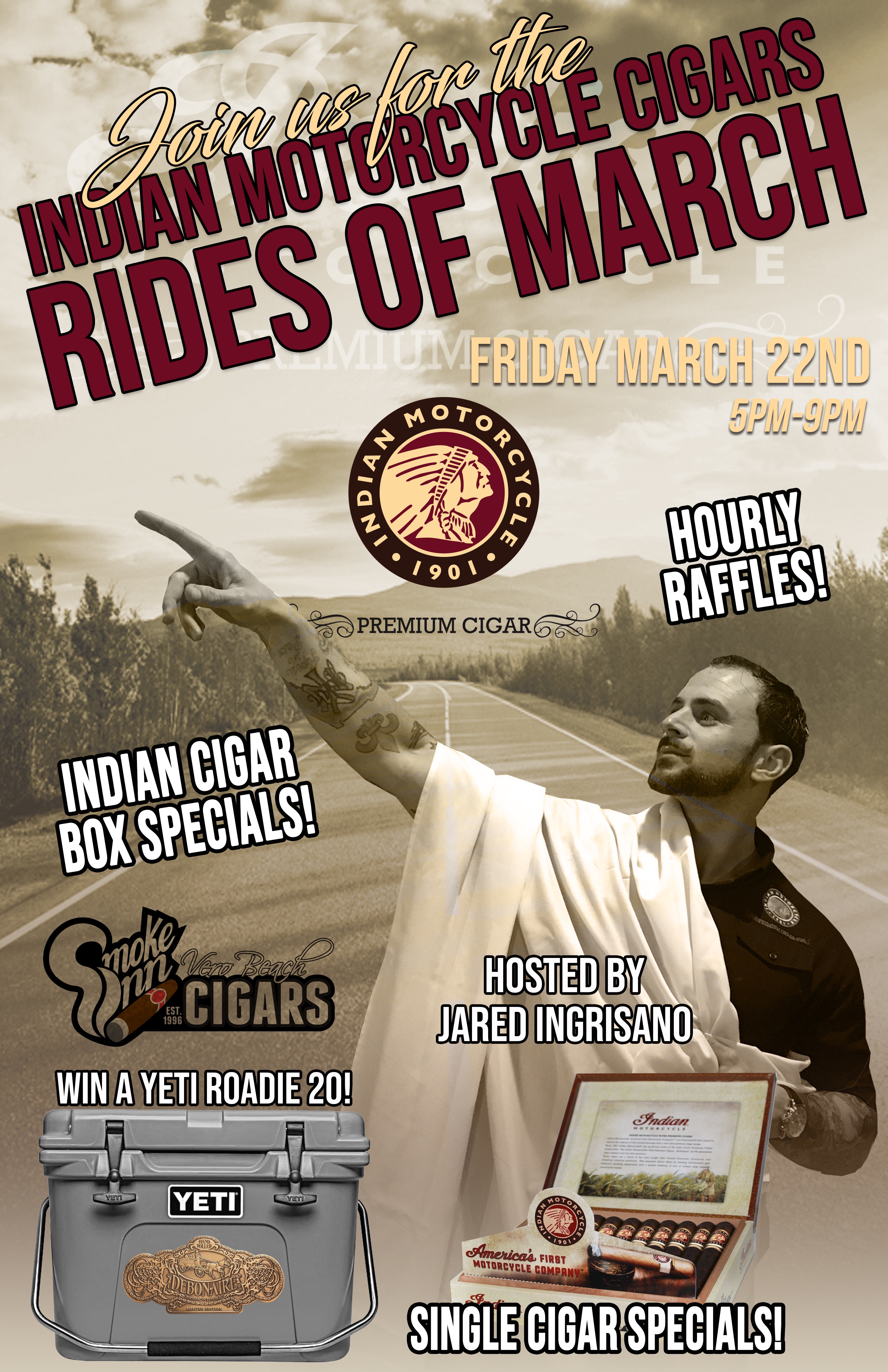 The Indian Cigars Rides of March is rolling into Vero Beach on March 22nd! Join Debonaire Cigars very own, Jared Ingrisano for all things Debonaire. The band is BACK with hourly raffles, Indian Cigar deals, and someone will be riding home with a YETI Roadie 20! See you on the 22nd…