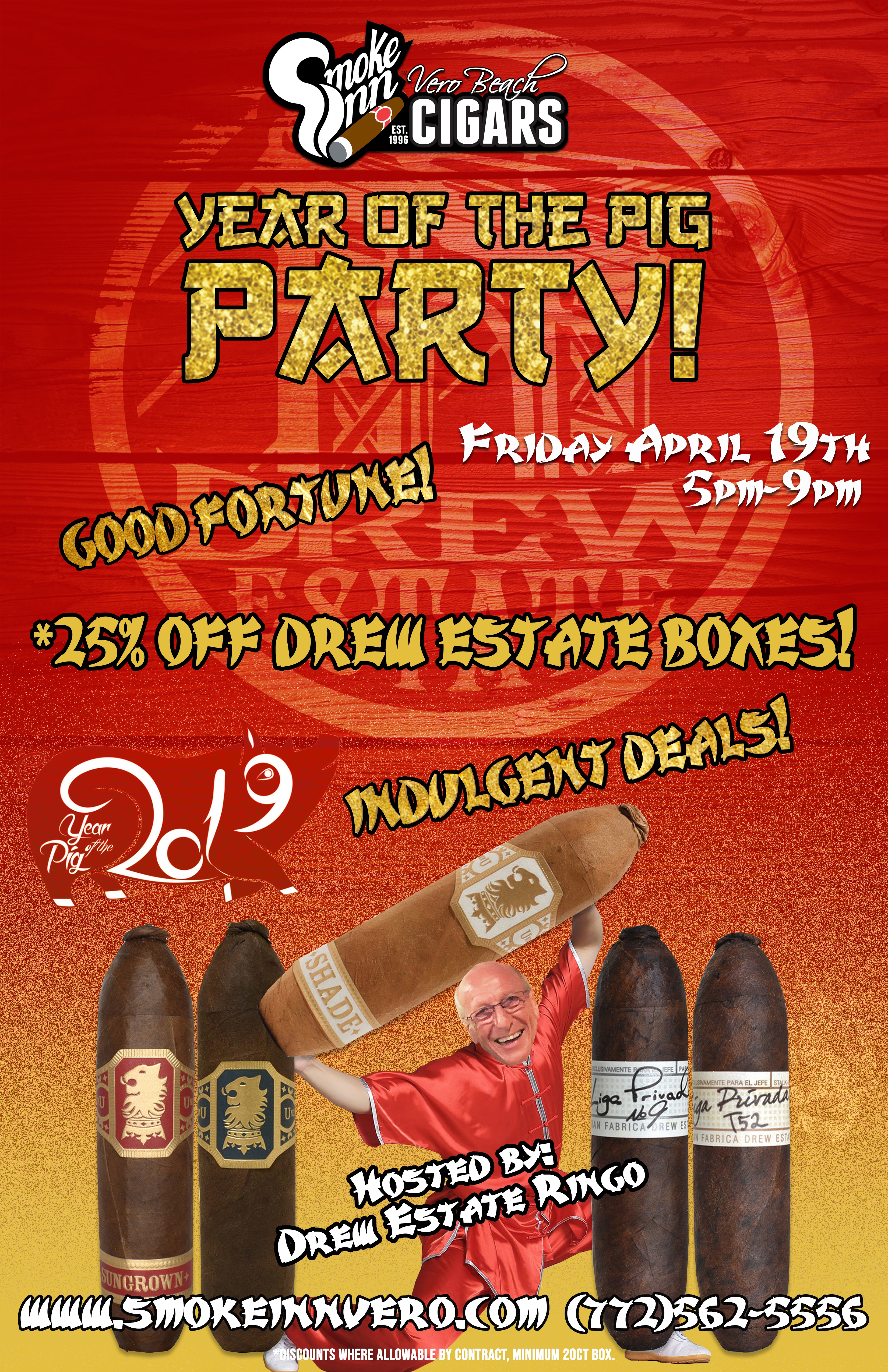 Join us on Friday, April 19th for our Drew Estate Cigars : The Rebirth of Cigars Year of the Pig Party. Pigs are known for being generous, and no one will be more generous this year than Drew Estate Ringo!